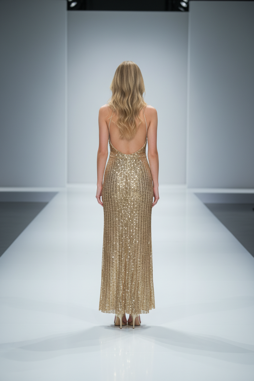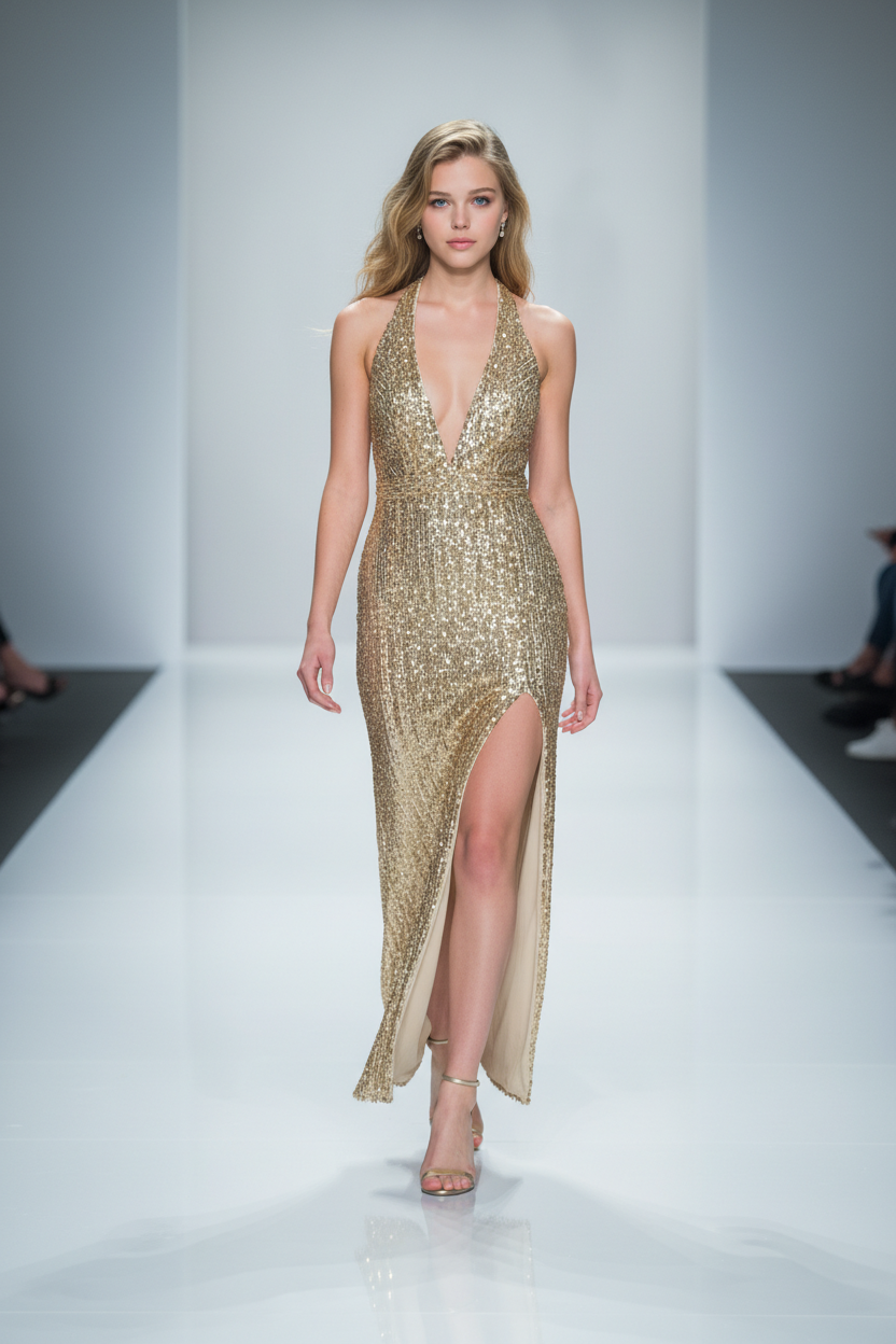 Beige Fully Gold Sequined Halter Gown with Side Slit