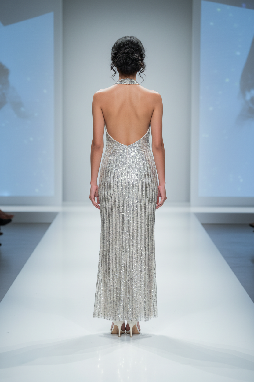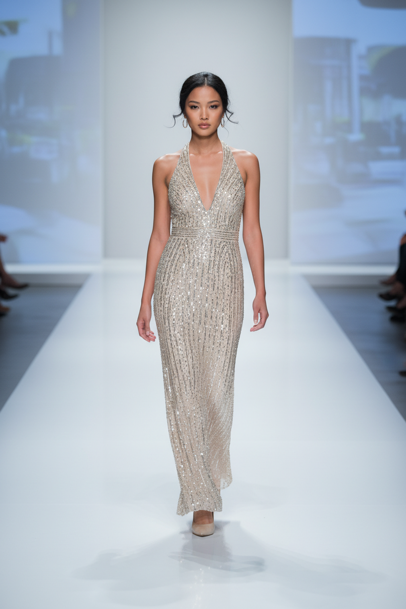 Beige Fully Silver Sequined Halter Gown with Side Slit