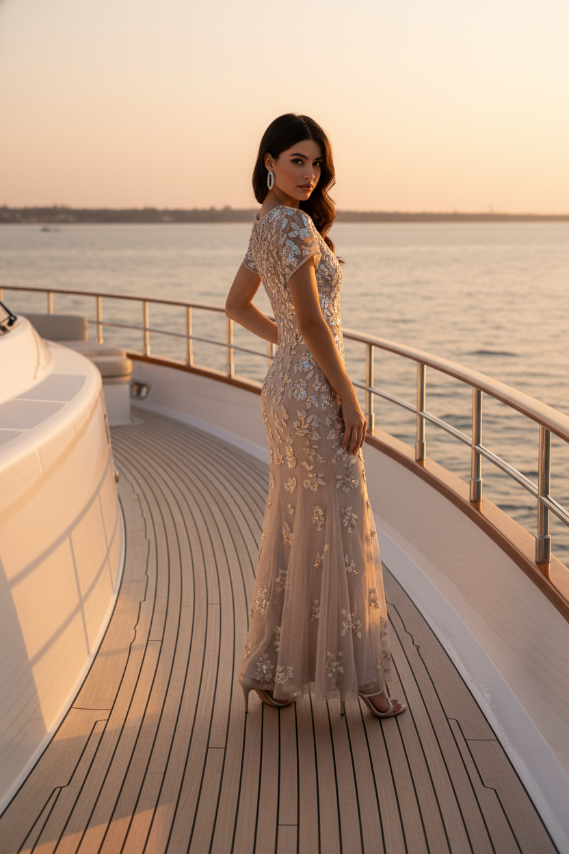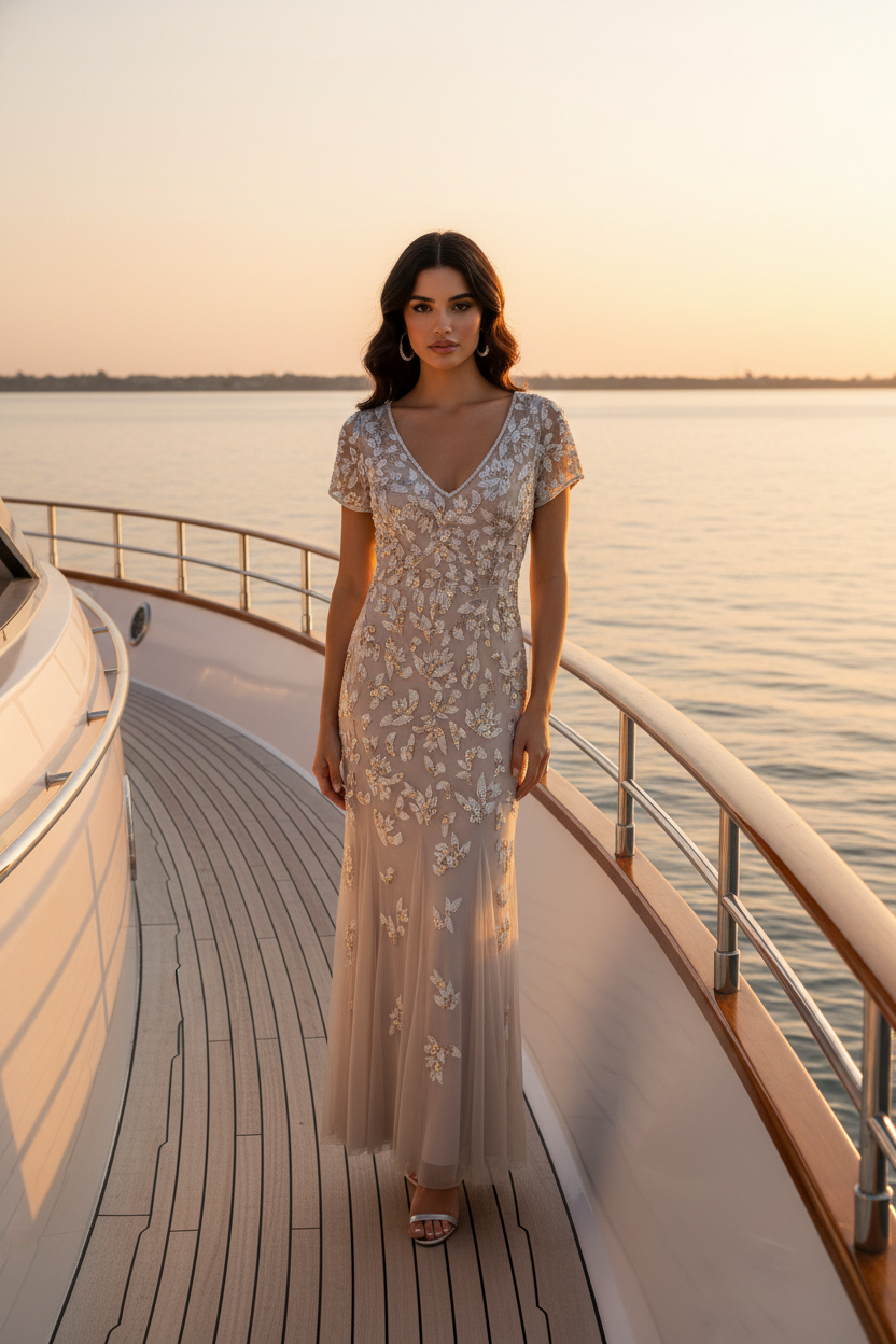 Biscotti Beige Beaded Dress with Godets, Size 6