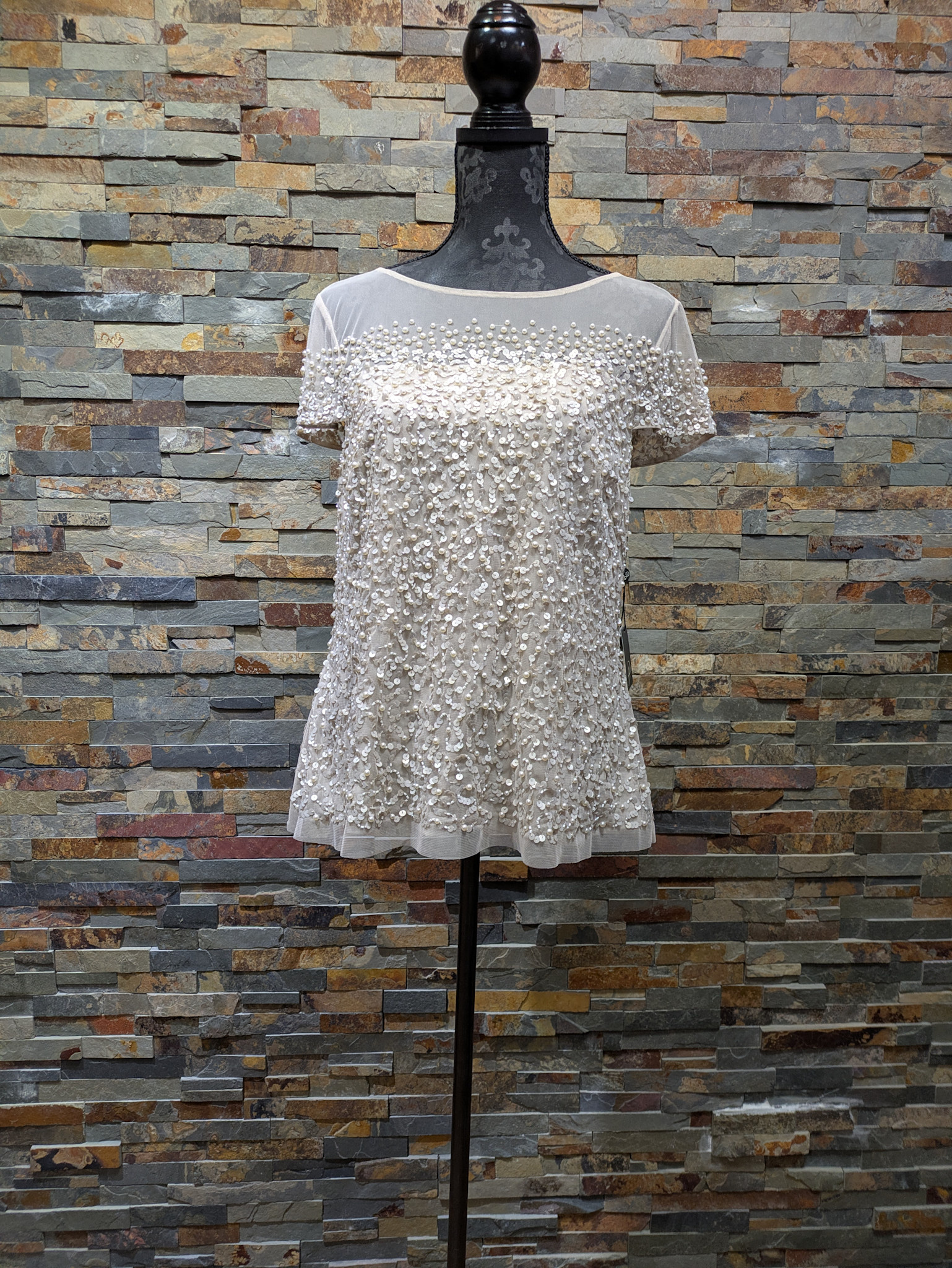 Biscotti Beige Sequin and Pearl Beaded Top, Size 14