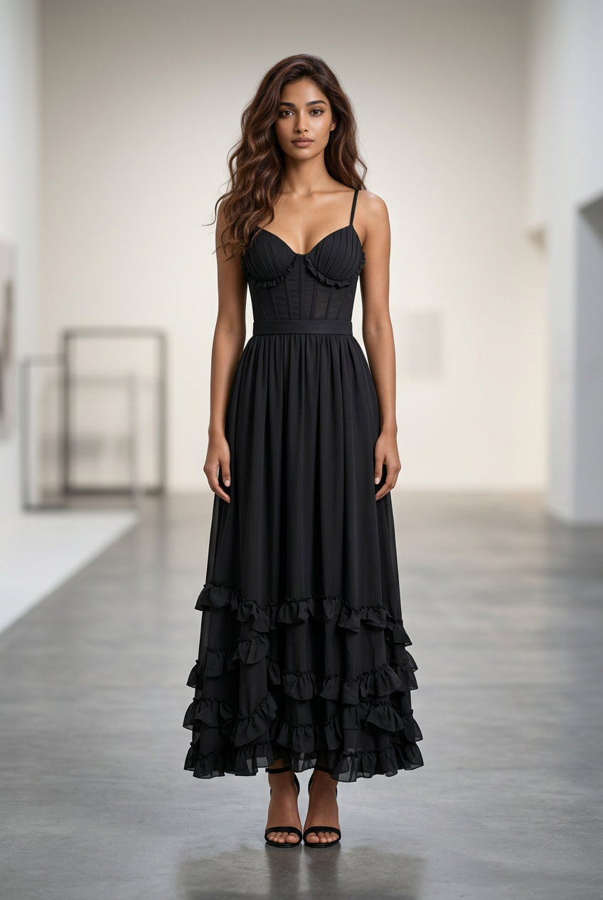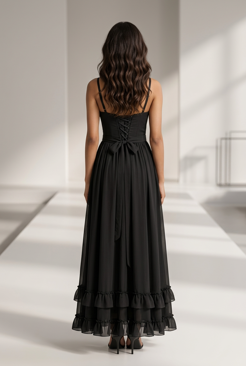 Black Corset Style Top with Full 3-Tier Ruffle Bottom and Lace Up Back Gown, Size 10