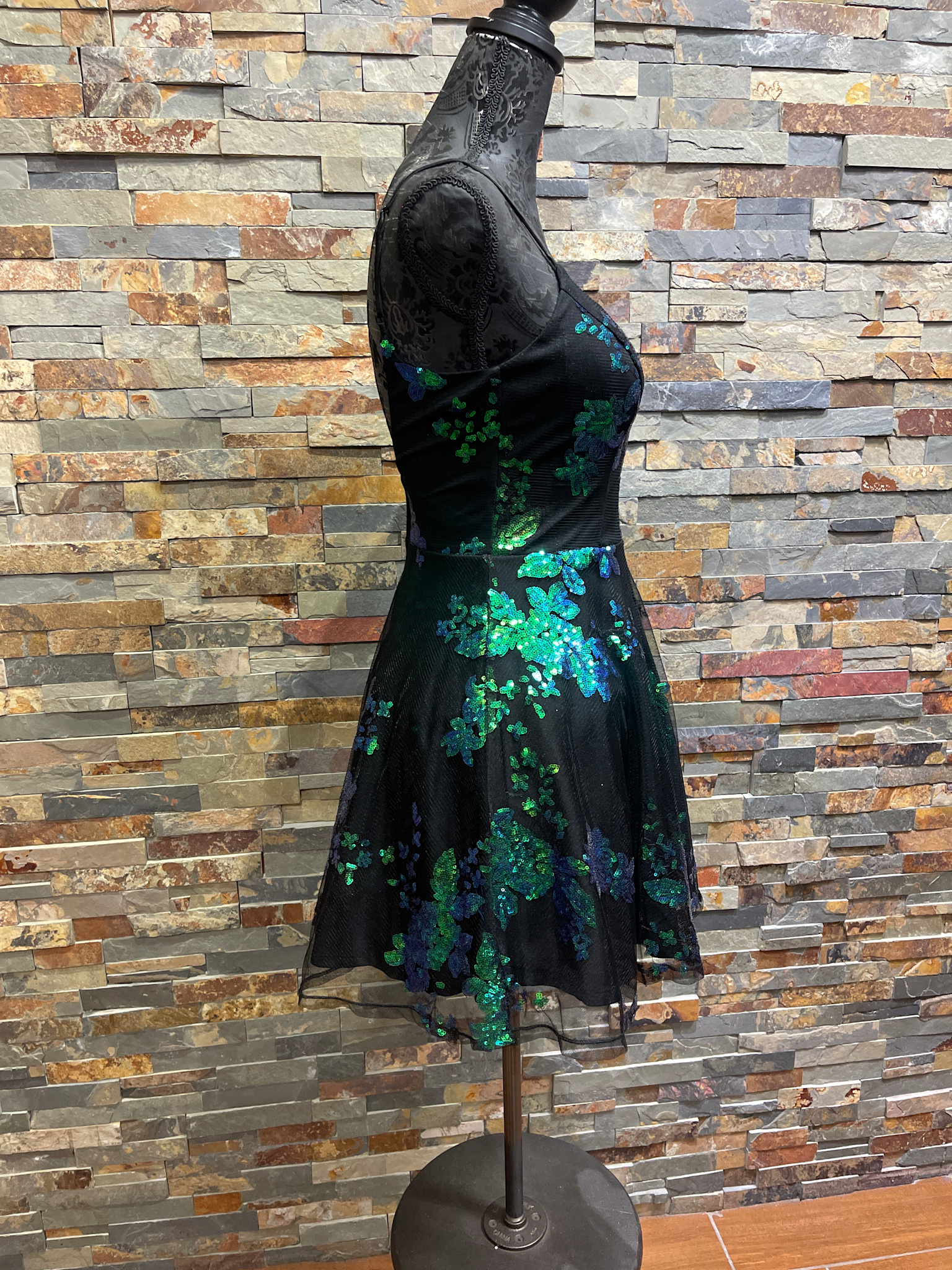 Black Fit & Flare Dress w/Green/Blue Sequin Floral Design