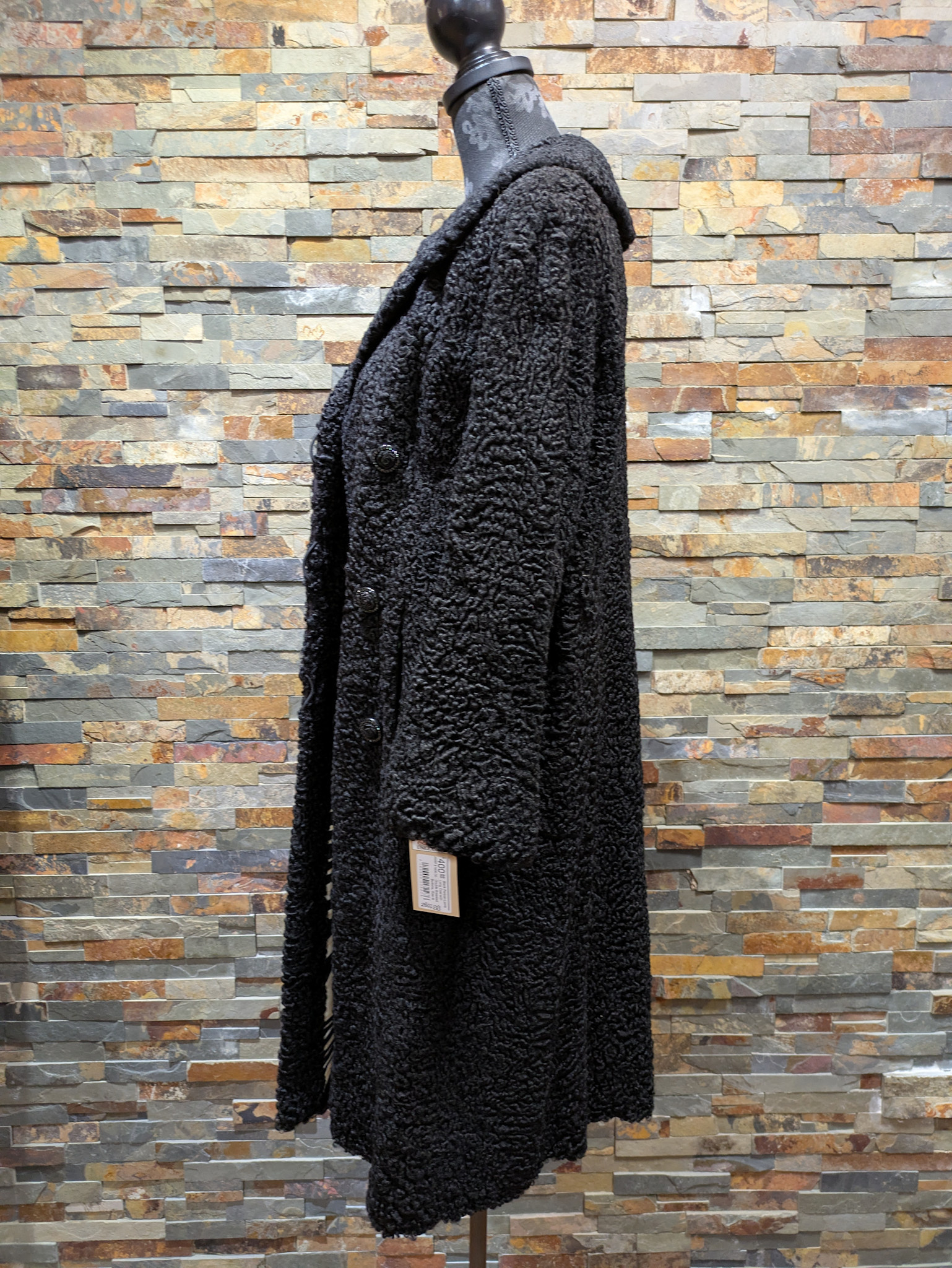 Black Persian Lamb Long Coat with Double Breasted Buttons, Size M
