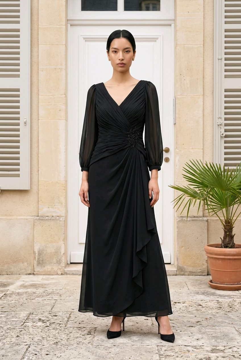 Black Ruched Bodice Sheer Sleeved Flowy Gown, Size 12
