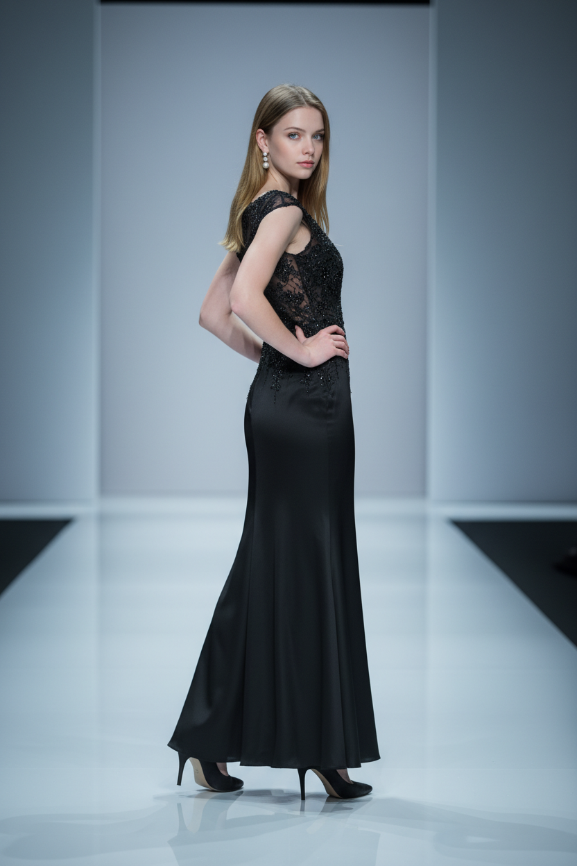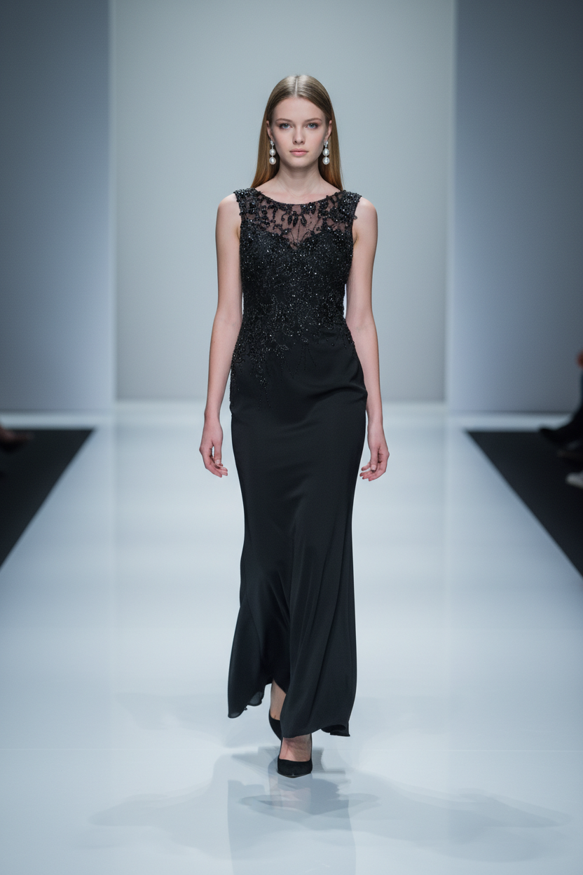 Black Silk Trumpet Gown with Embellished Bodice, Size 4