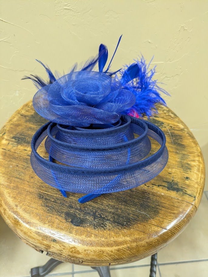 Blue Fascinator with Feathers and Circle Ribbons