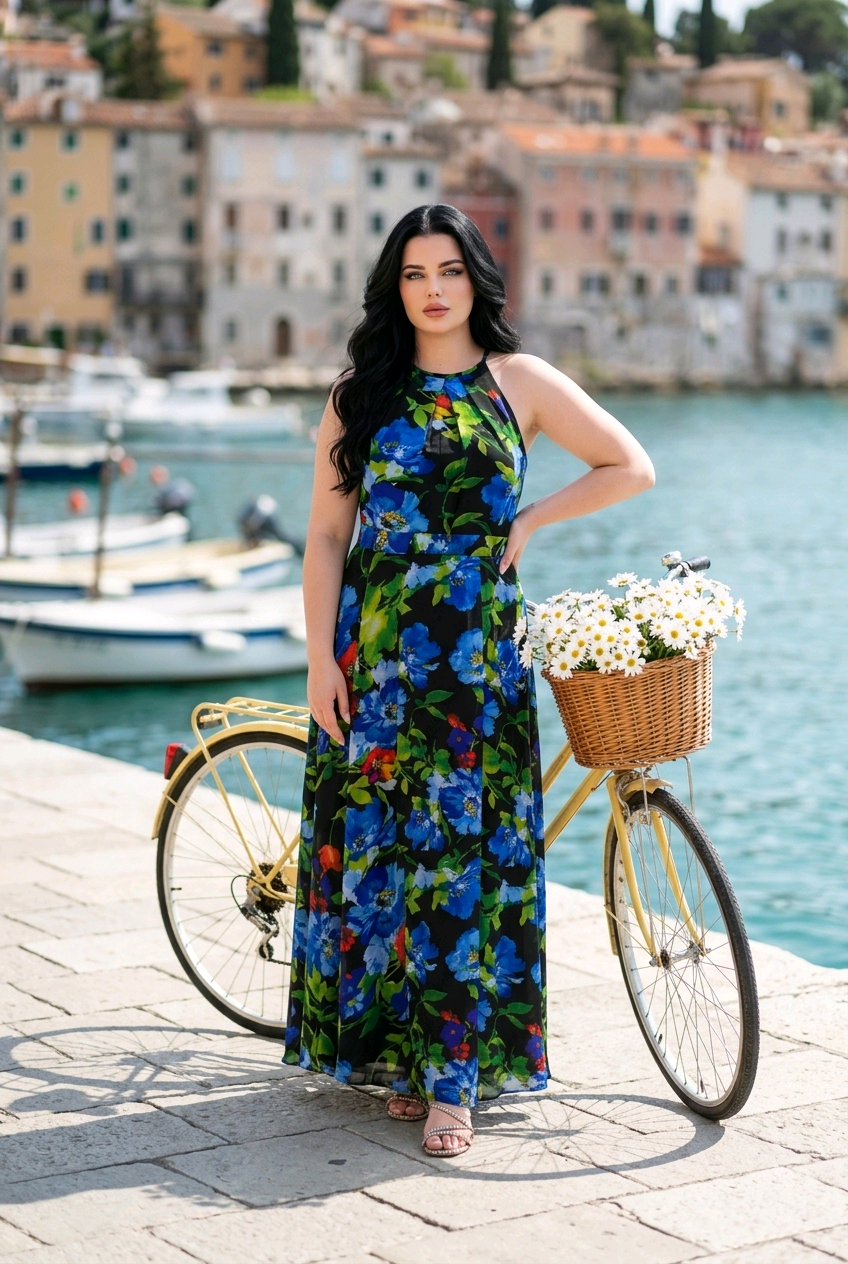 Blue Floral Halter Gown with Wrap Skirting, Size 16