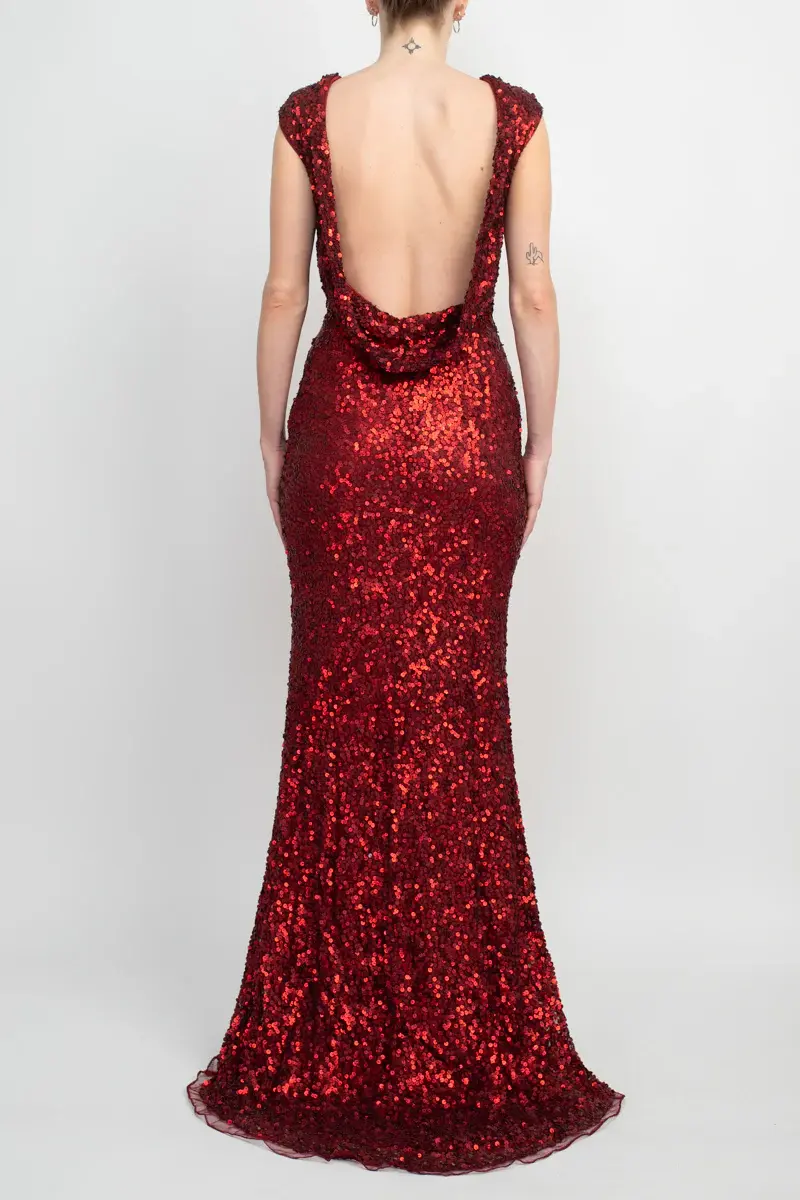 Burgundy Cap Sleeve Cowl Back Sequin Bodycon Gown, Size 18