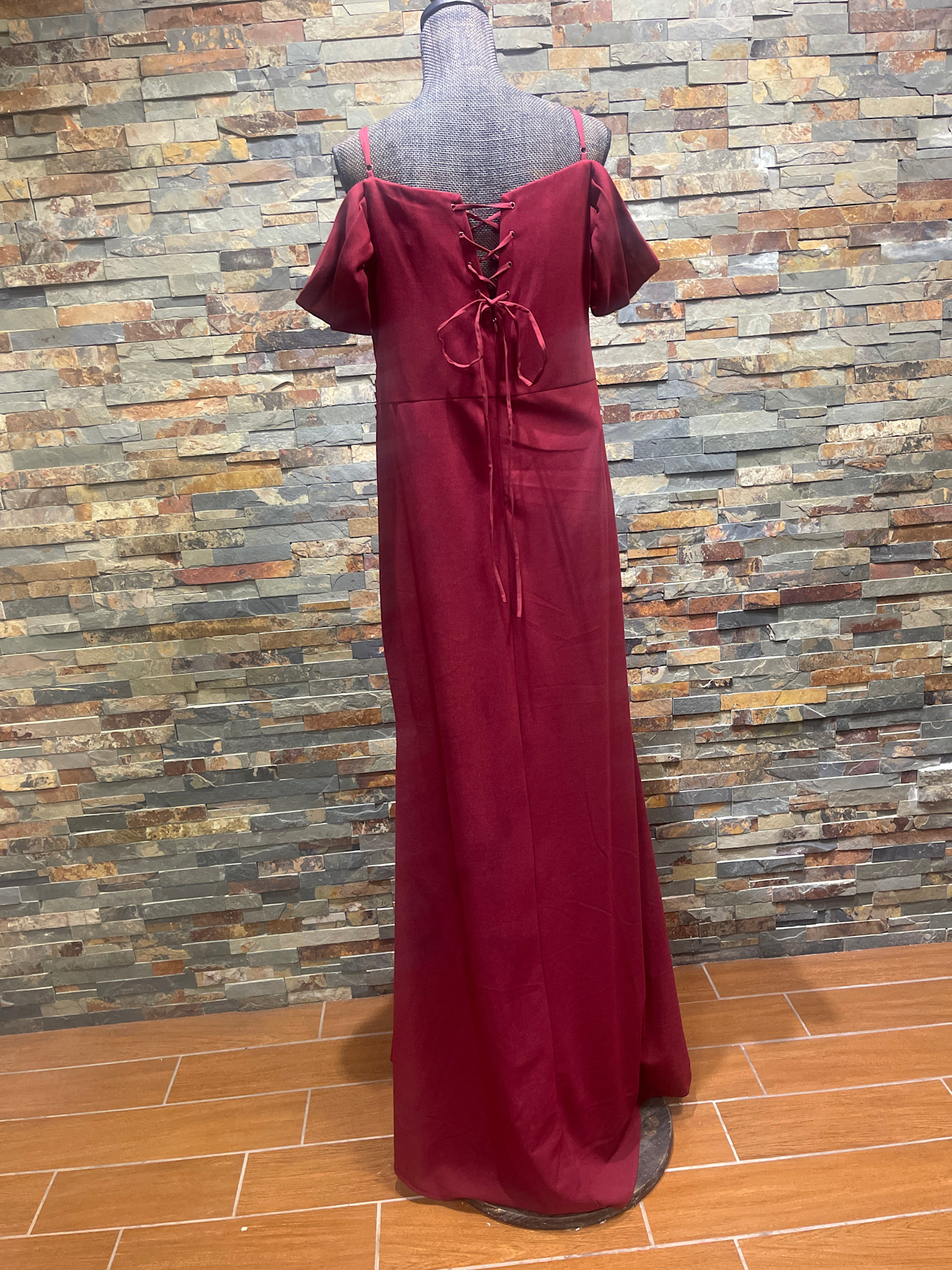 Burgundy Cold Shoulder Ruched Gown with Lace-up Back, Size 3XL