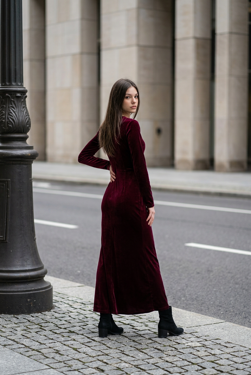 Red Velvet Long Sleeve Grecian-Style Gown, Size M