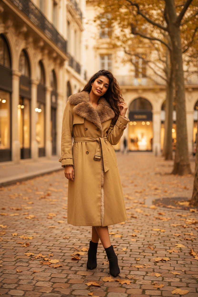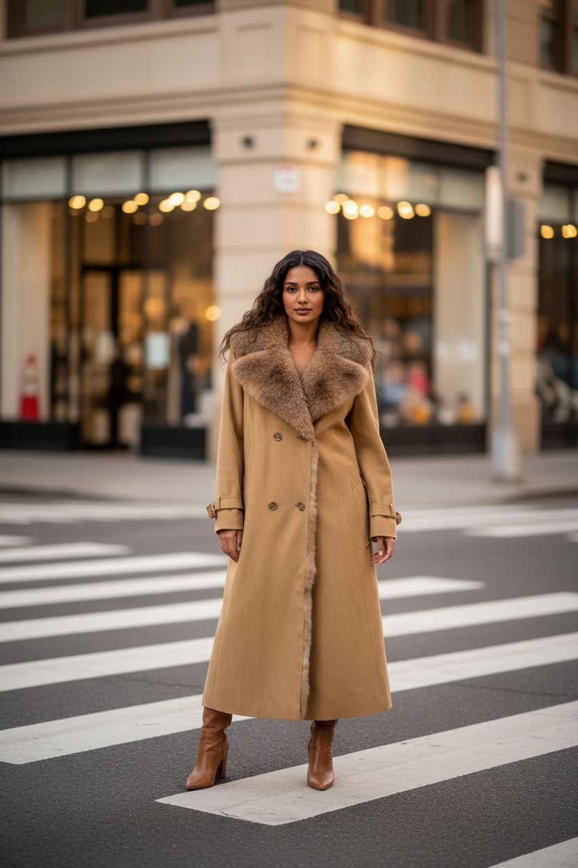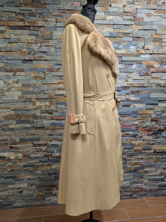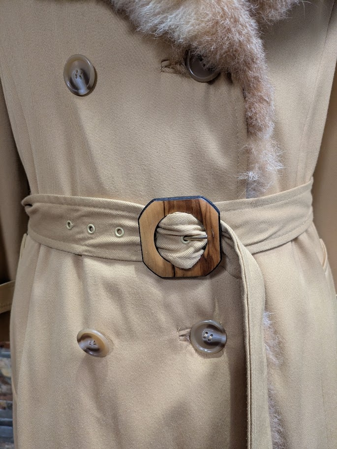 The exterior of this coat is a soft yellow cotton material with chic details, while the lining of the coat's body is made of a crystal-dyed New Zealand brushtail possum