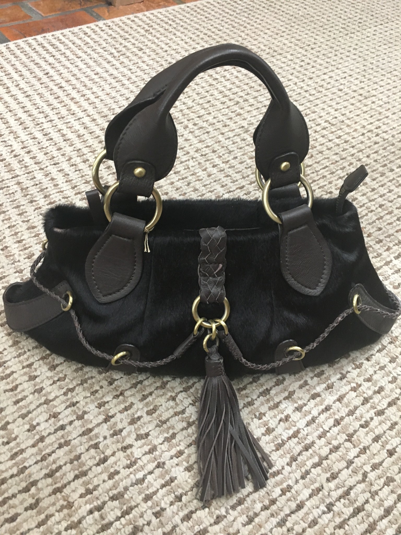 Dark Brown Leather and Cowhide Handbag