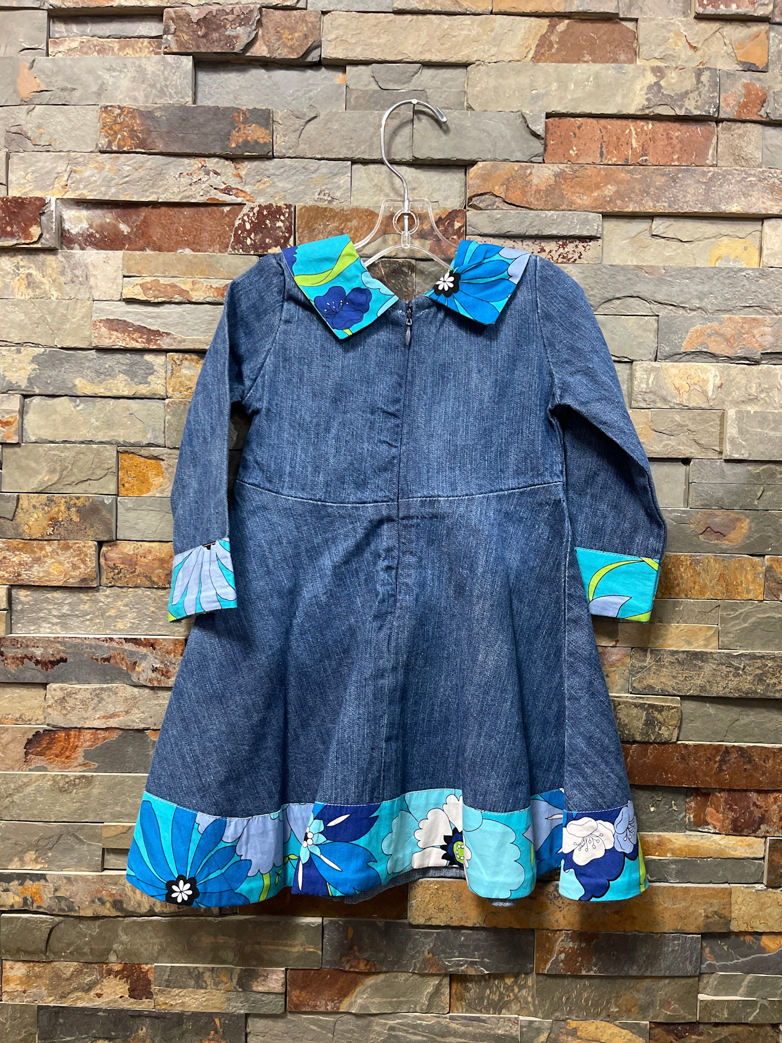 Denim Blue Dress with Floral Print Trim, Size 12M