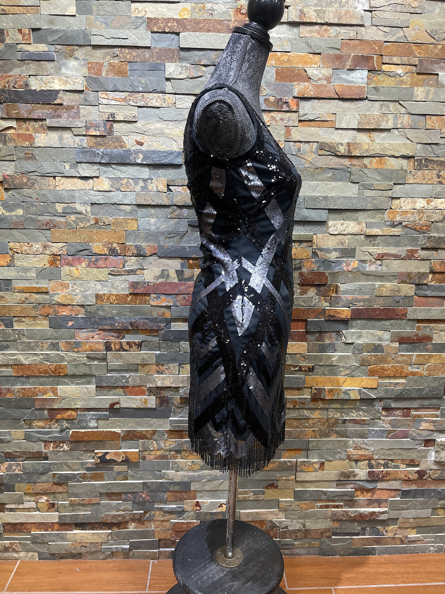 Gray and Black V Pattern Sequin Fringed Dress, Size 0