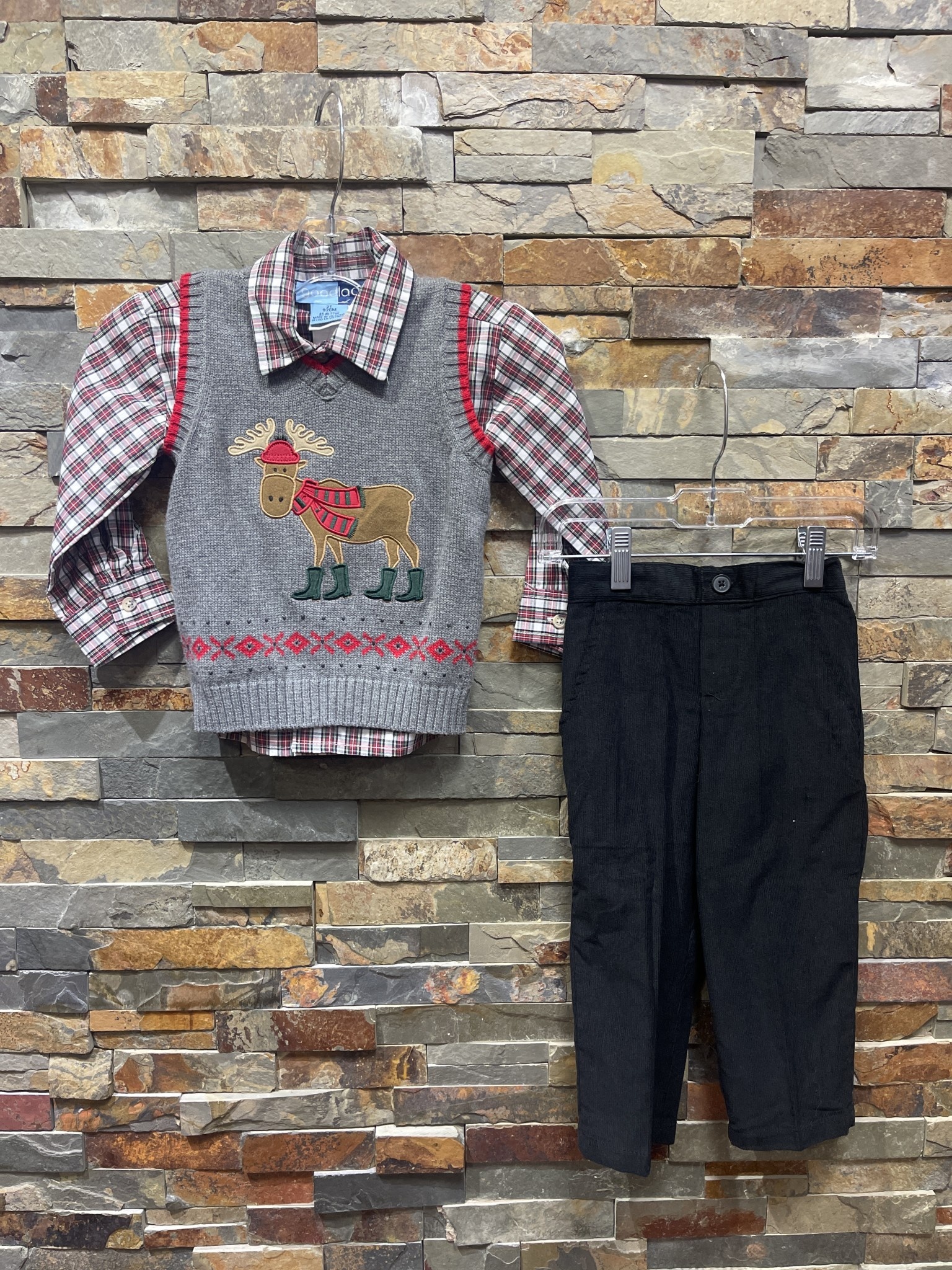 Gray Marching Moose Sweater Vest, Plaid Shirt & Black Pant Set