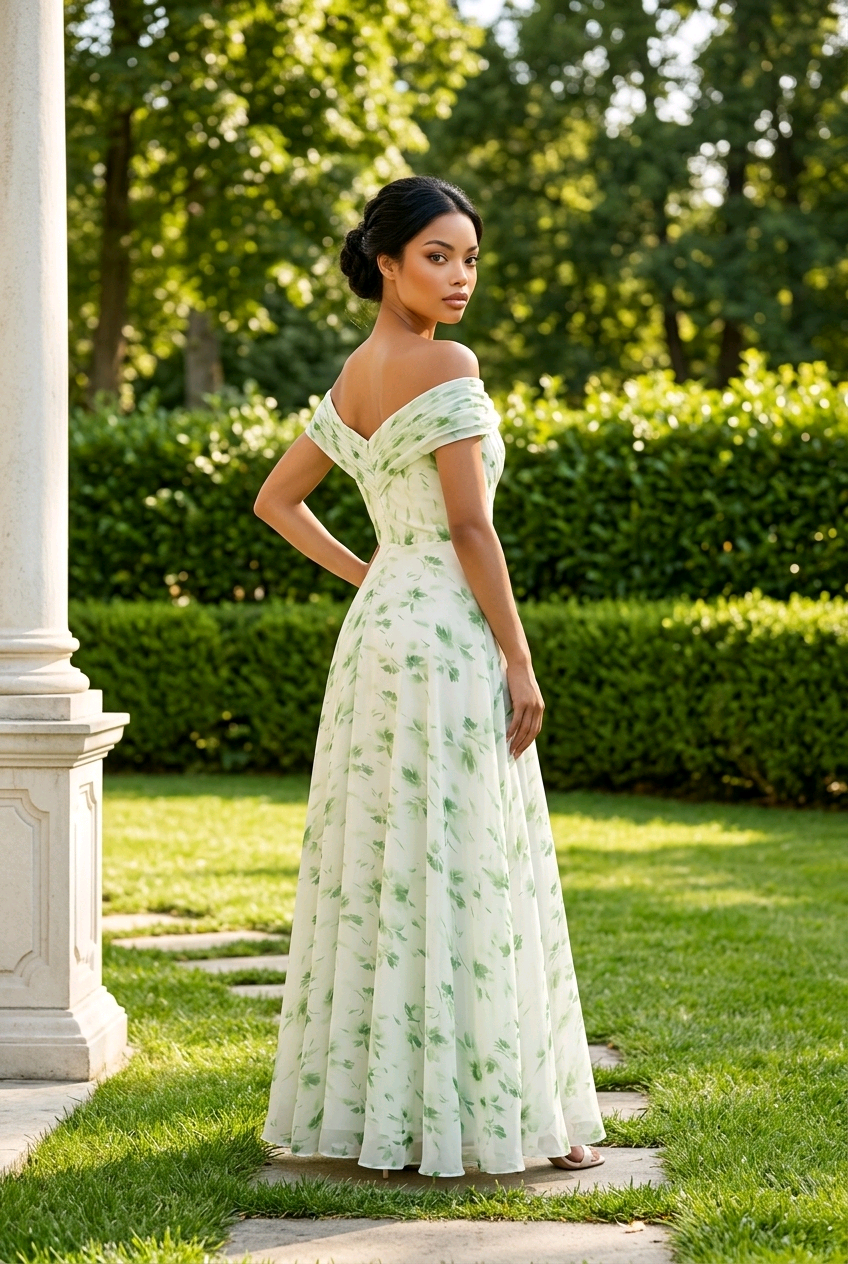 Green Floral Gown with Pleated and Embellished Top, Size 8