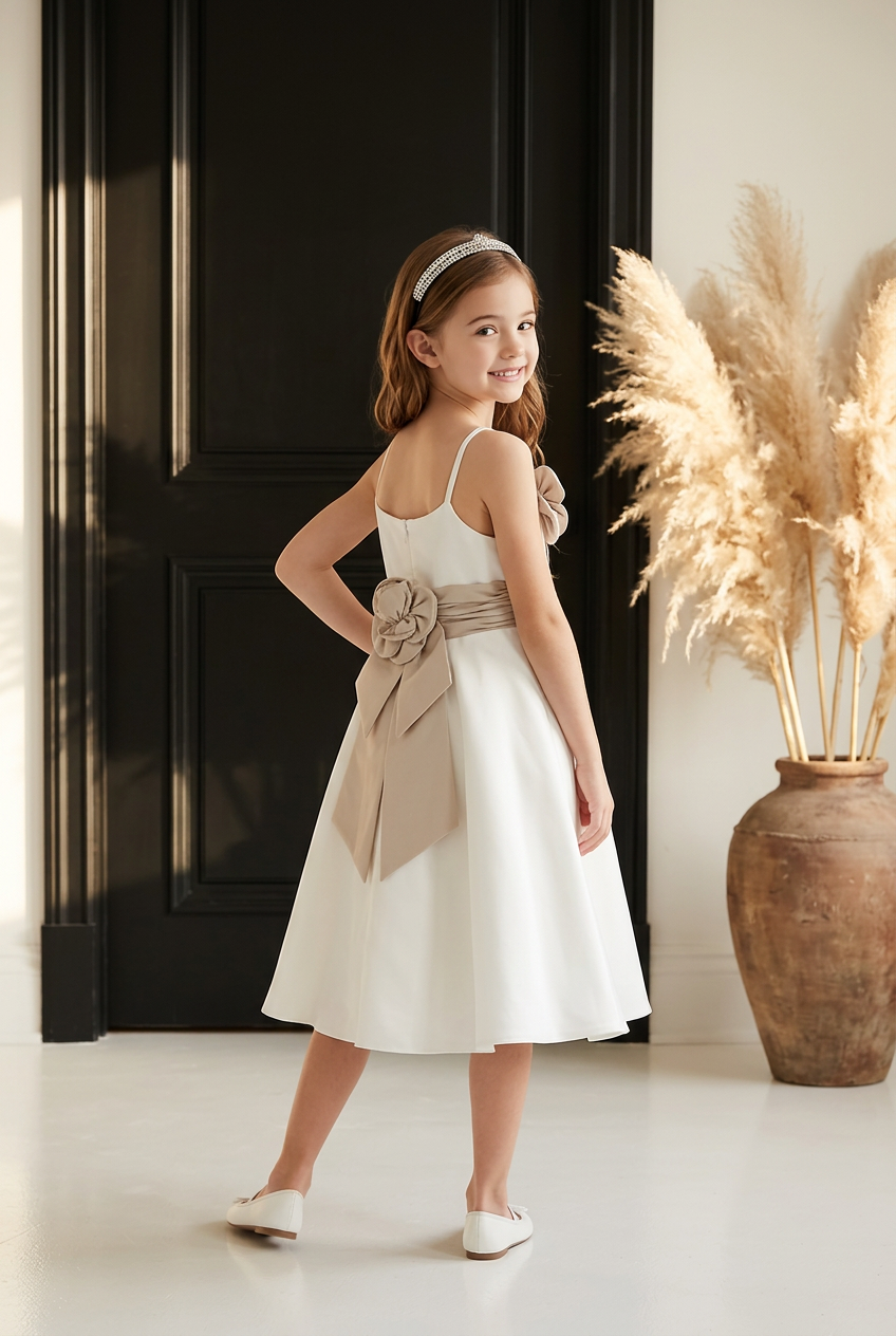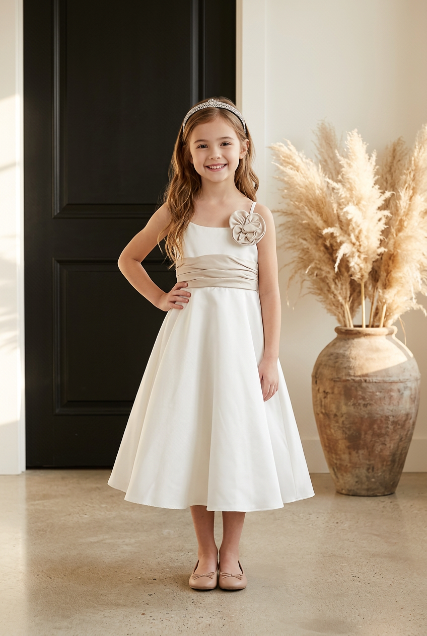 Ivory Satin Girls Dress with Latte Flowers and WaistBand, Size 4