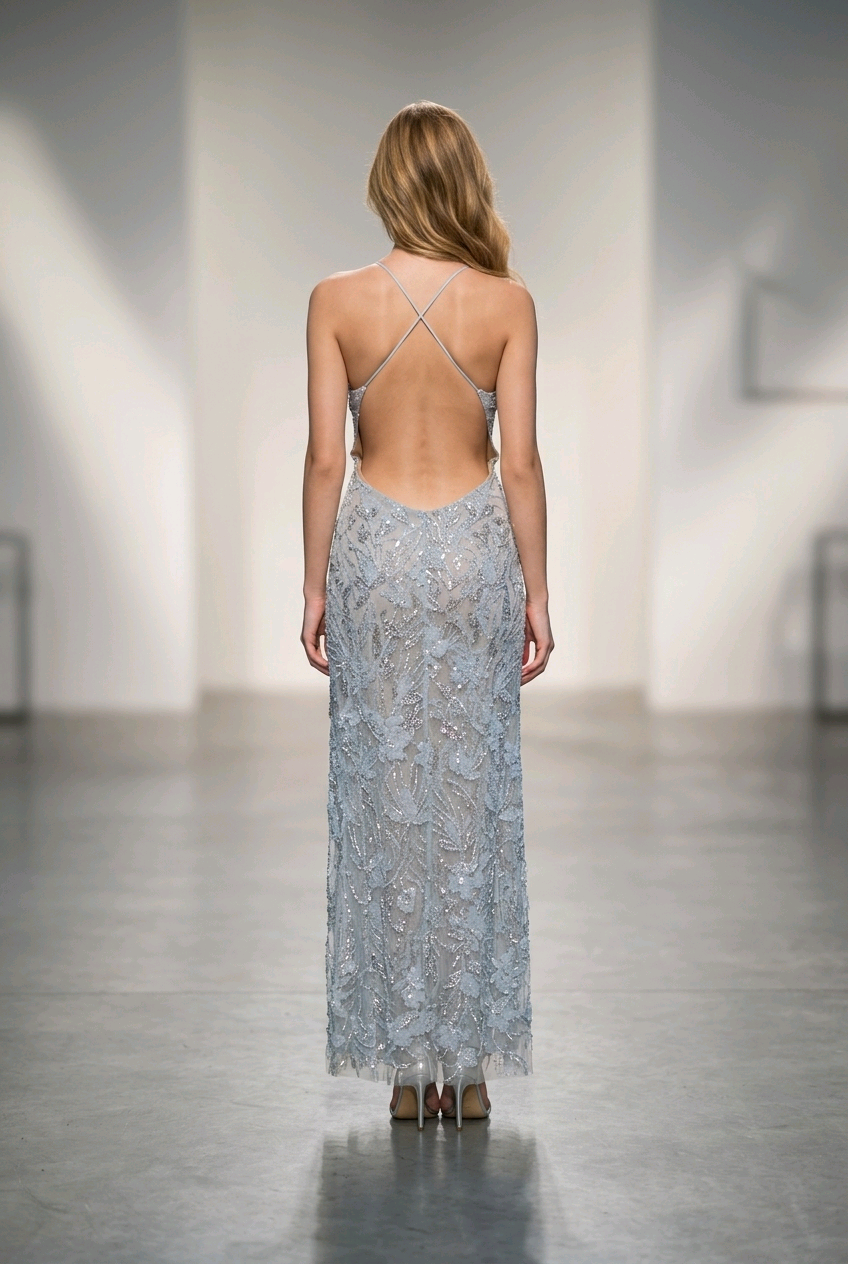 Light Blue Lace & Beaded Gown with Cross-Strap Back, Size 10