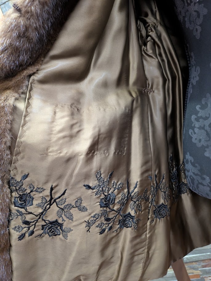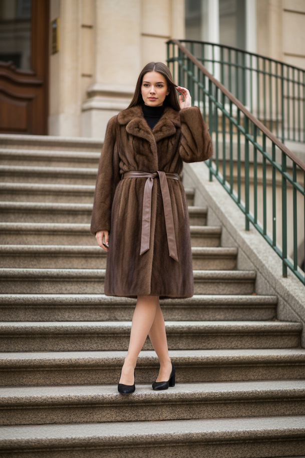 Brown Mahogany Mink Fur Coat with Notched Lapel and Leather Belt, Size S