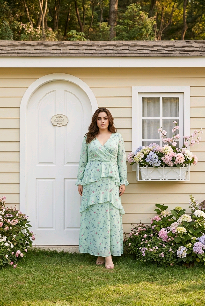 Mint Green Floral Gown with Ruffles and Open Back, Size 16