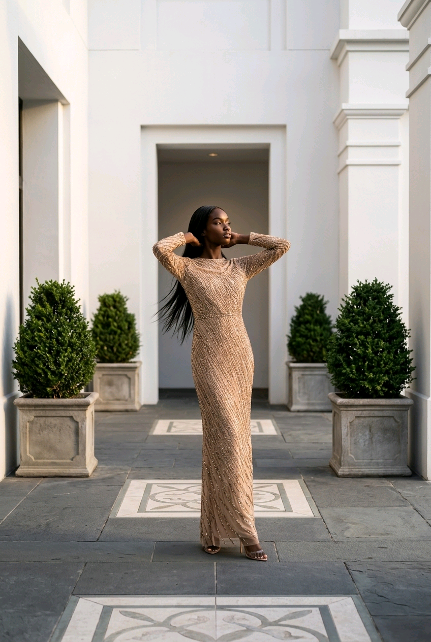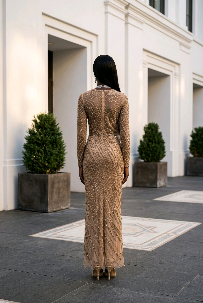 Mocha Long Sleeve Gown with Wave Patterned Beads, Size 8