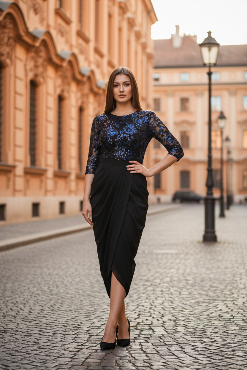 Navy Gown with Mesh Sequined Top and Ruched Skirt, Size 4