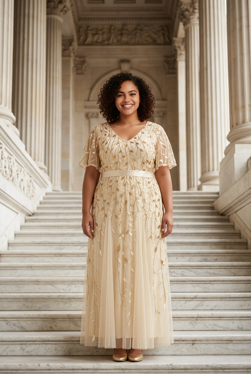 Pale Yellow Sequin and Leaves Embellished Overlay Gown, Size XL