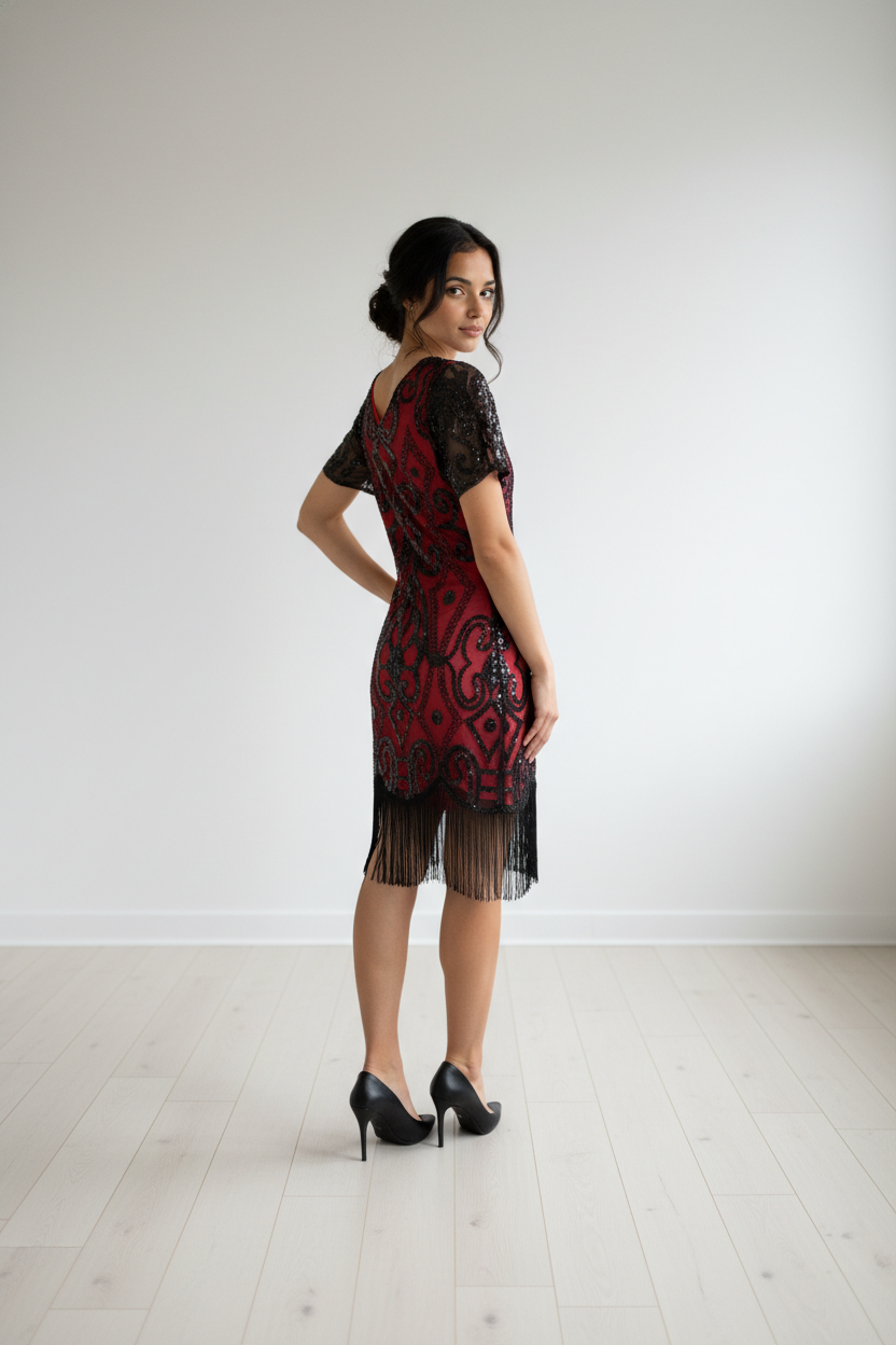 Red Dress with Black Sequin Detail, Fringe Hem, Size M