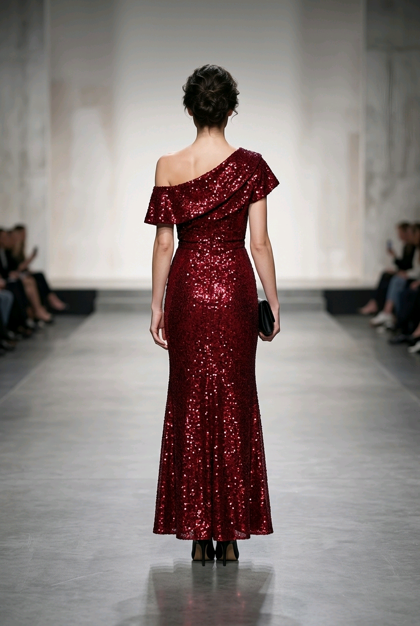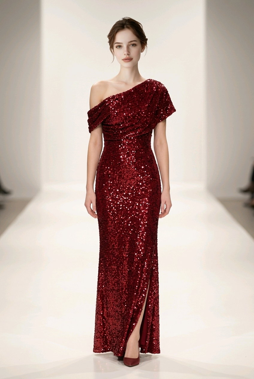 Red Sequined Velvet Off-One-Shoulder Gown, Size 9