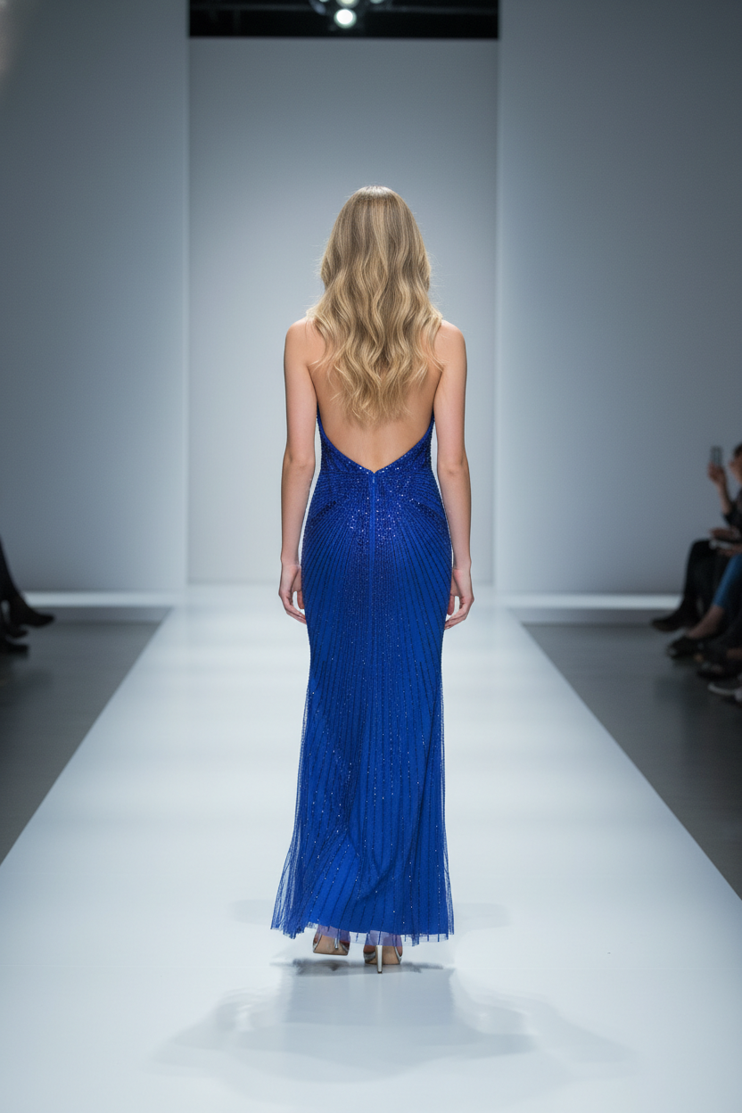 Royal Blue Crystal Beaded Halter Gown, Size 2