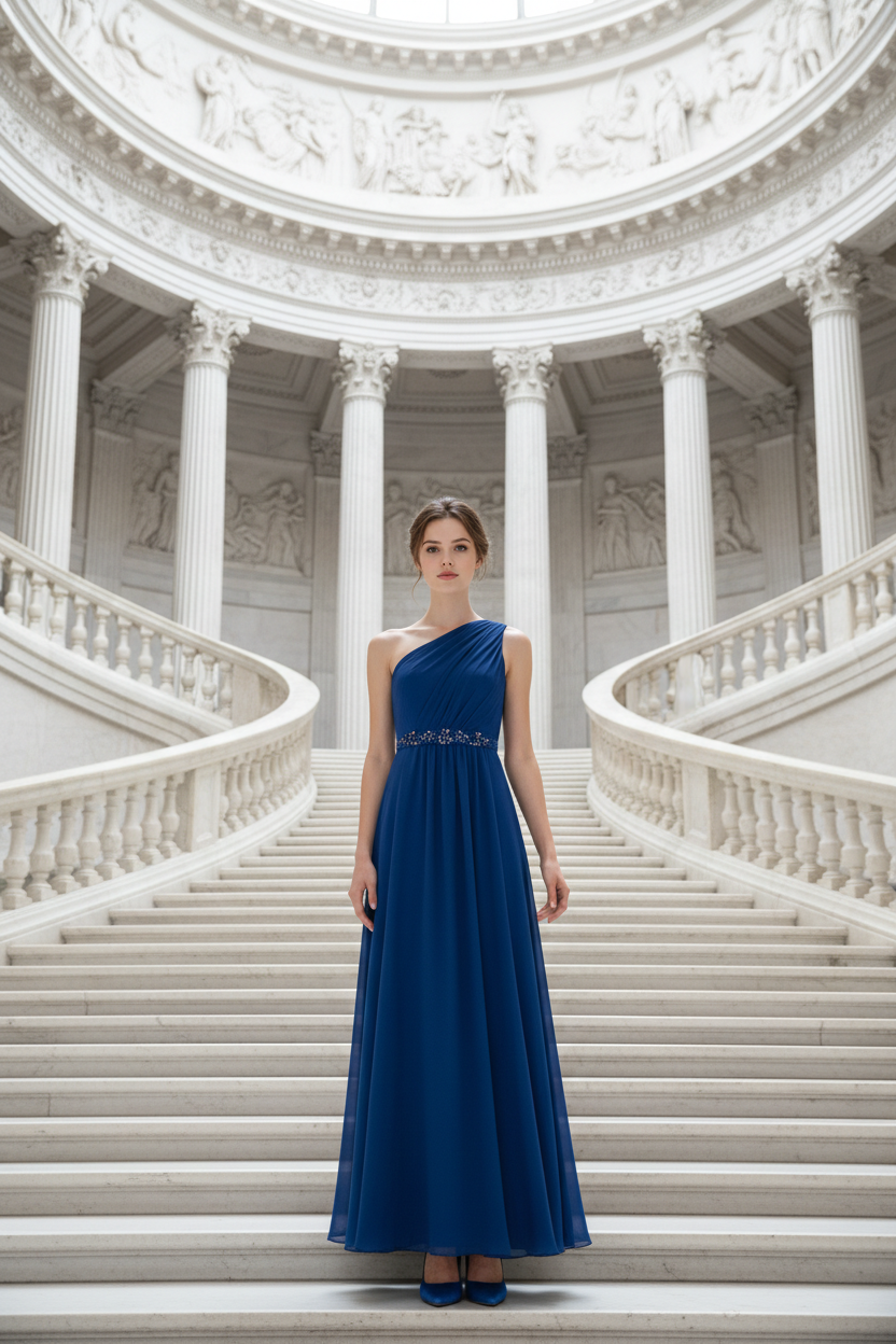 Royal Blue One-Shoulder Gown with Jeweled Waist, Size 4