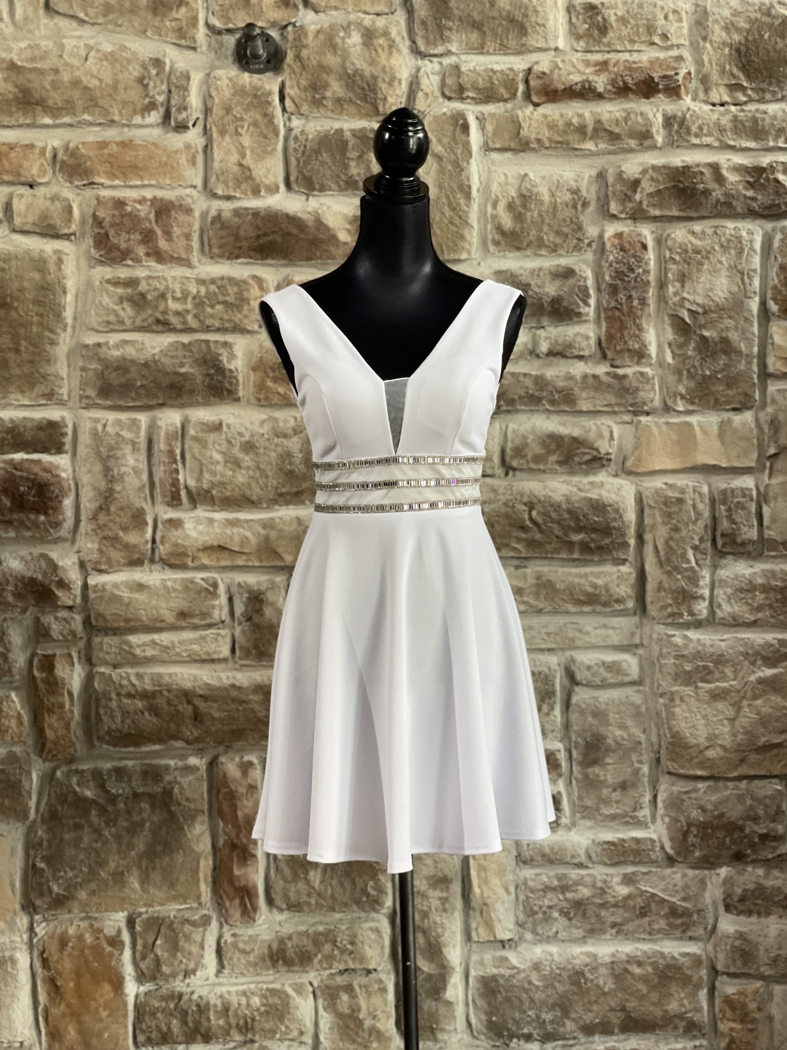 White 3 Row Rhinestone Mesh V Dress
